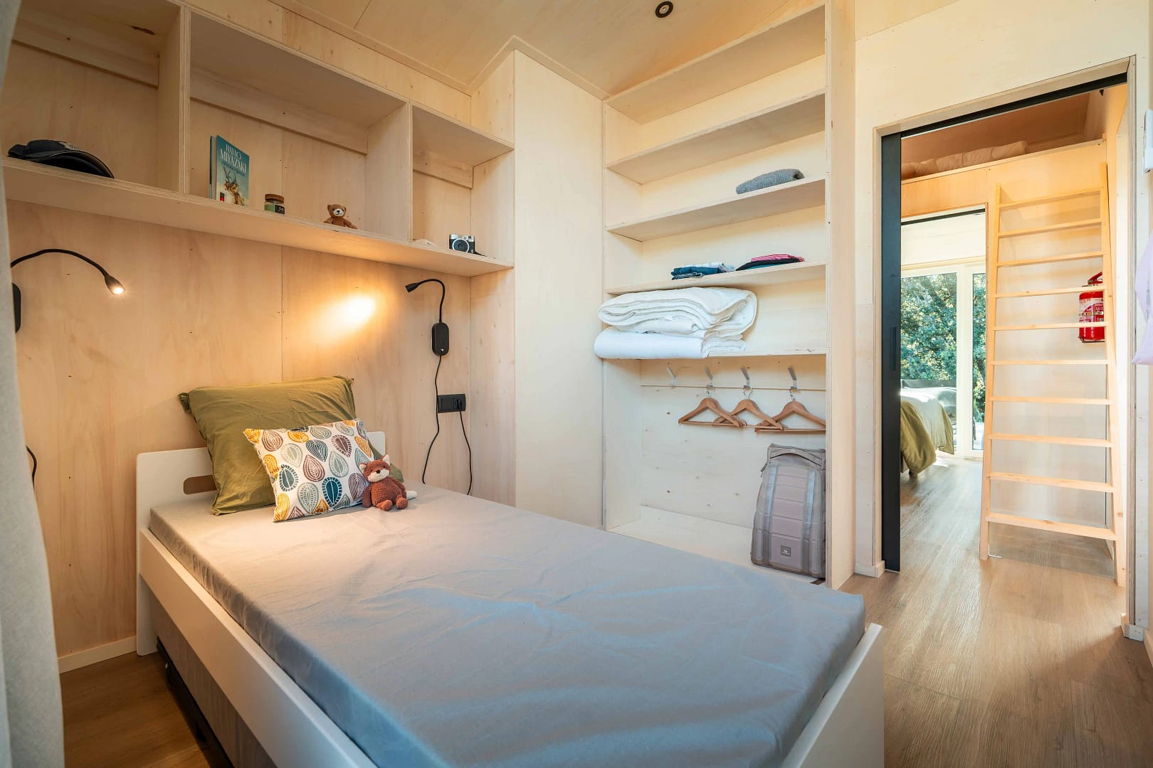 Exclusively in 2025, discover this brand new top-of-the-range accommodation designed to immerse you in the heart of nature. Set comfortably on the edge of the forest, this cottage is at one with nature. With its green roof and numerous windows, it blends in perfectly with its surroundings. With a double bed in the main bedroom, a pull-out bed in the second bedroom and a 140×190 bed on the mezzanine, Wild Spirit can sleep up to 5 people. It is equipped with underfloor heating and air conditioning for an optimal experience in all seasons. Relax in your private sauna with a view of the forest. Take a dip in your Nordic bath after sunbathing on your large wooden terrace. Enjoy the luxury of escaping to the heart of nature.